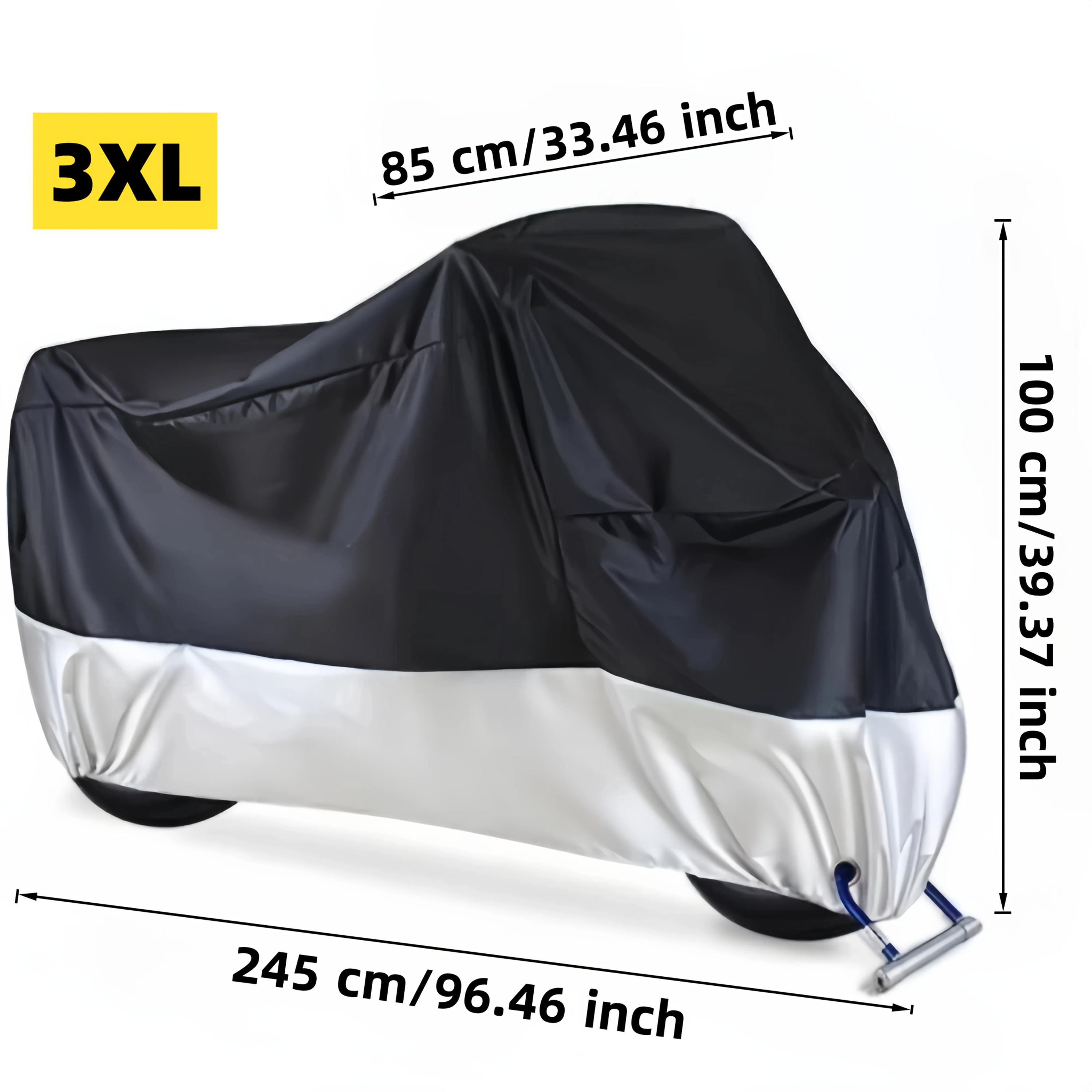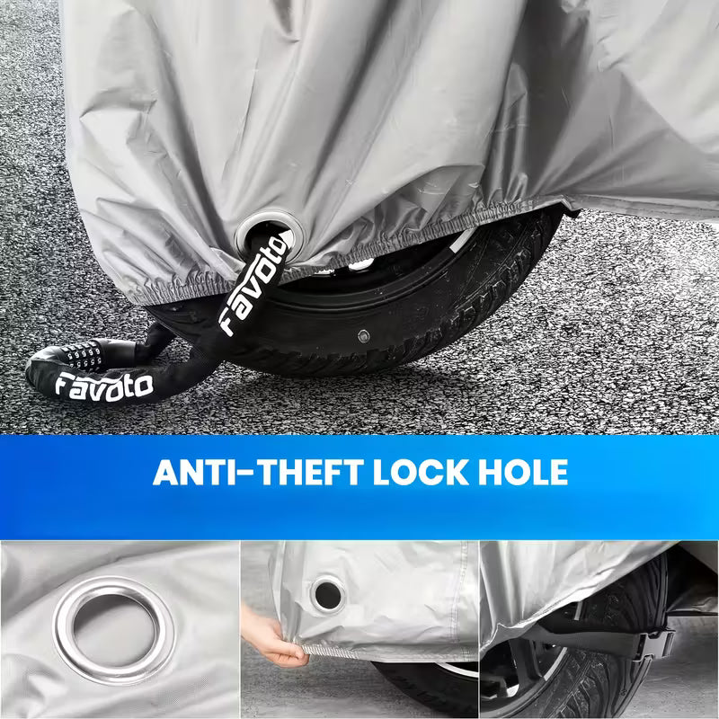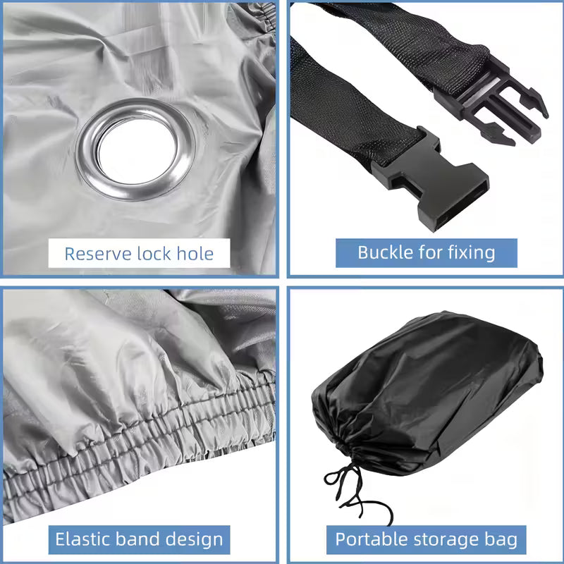 Husa are orificiu pentru lacat și curea de prindere stabilă. Organizarea spațiului devine simplă, iar bicicleta rămâne fixă, protejată și securizată.